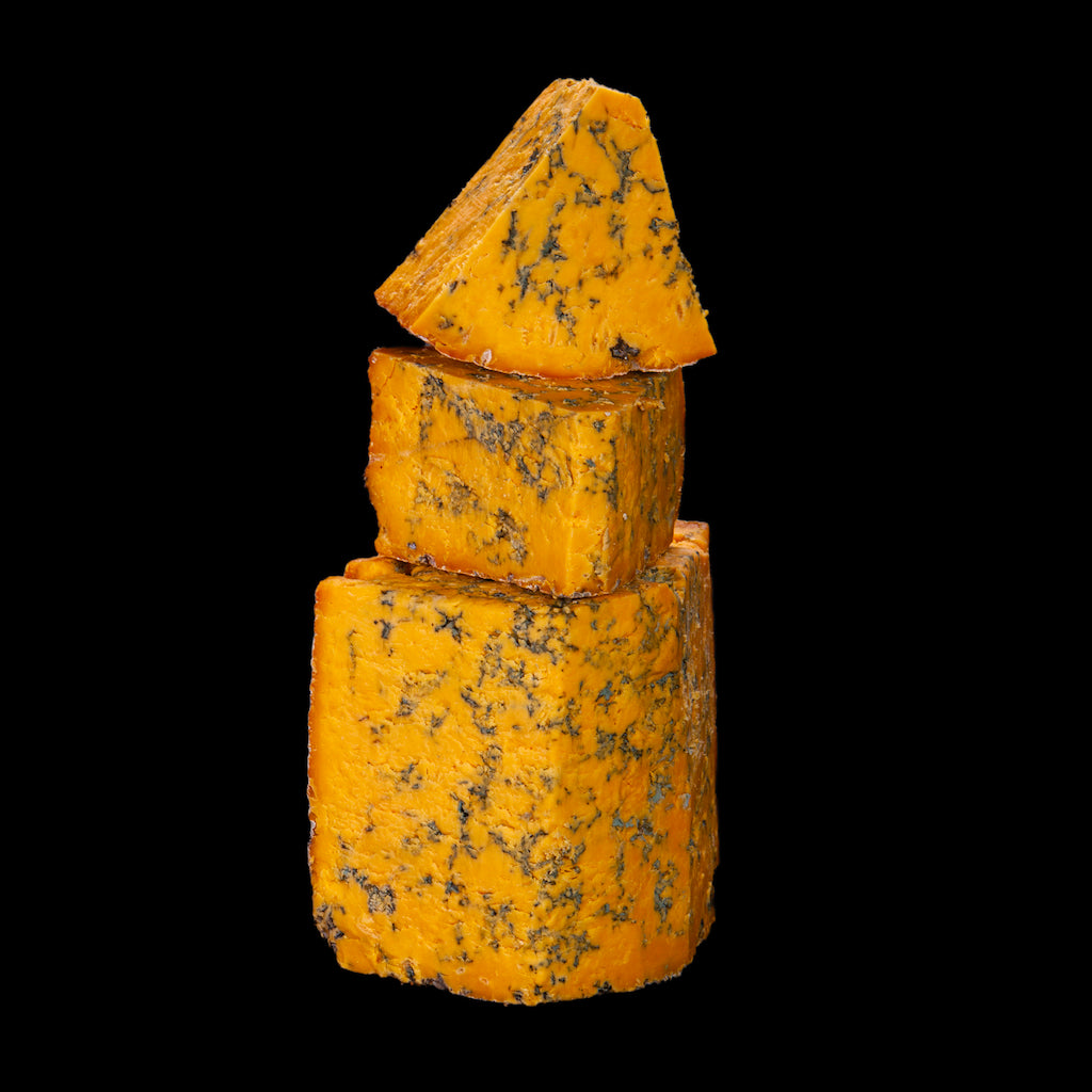 Shropshire Blue ist ein charaktervoller, cremiger Blauschimmelkäse aus England. Er erinnert an Stilton, wirkt jedoch oft etwas kräftiger und frischer im Abgang. Sein orangefarbener Teig (durch Annatto) mit blaugrüner Marmorierung liefert ein vollmundiges, buttriges Mundgefühl, dazu nussige und leicht karamellige Noten, balanciert von einer angenehmen, pikanten Würze.